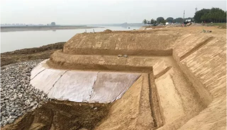 王庄险工改建:边坡稳定槽及铺好的土工布